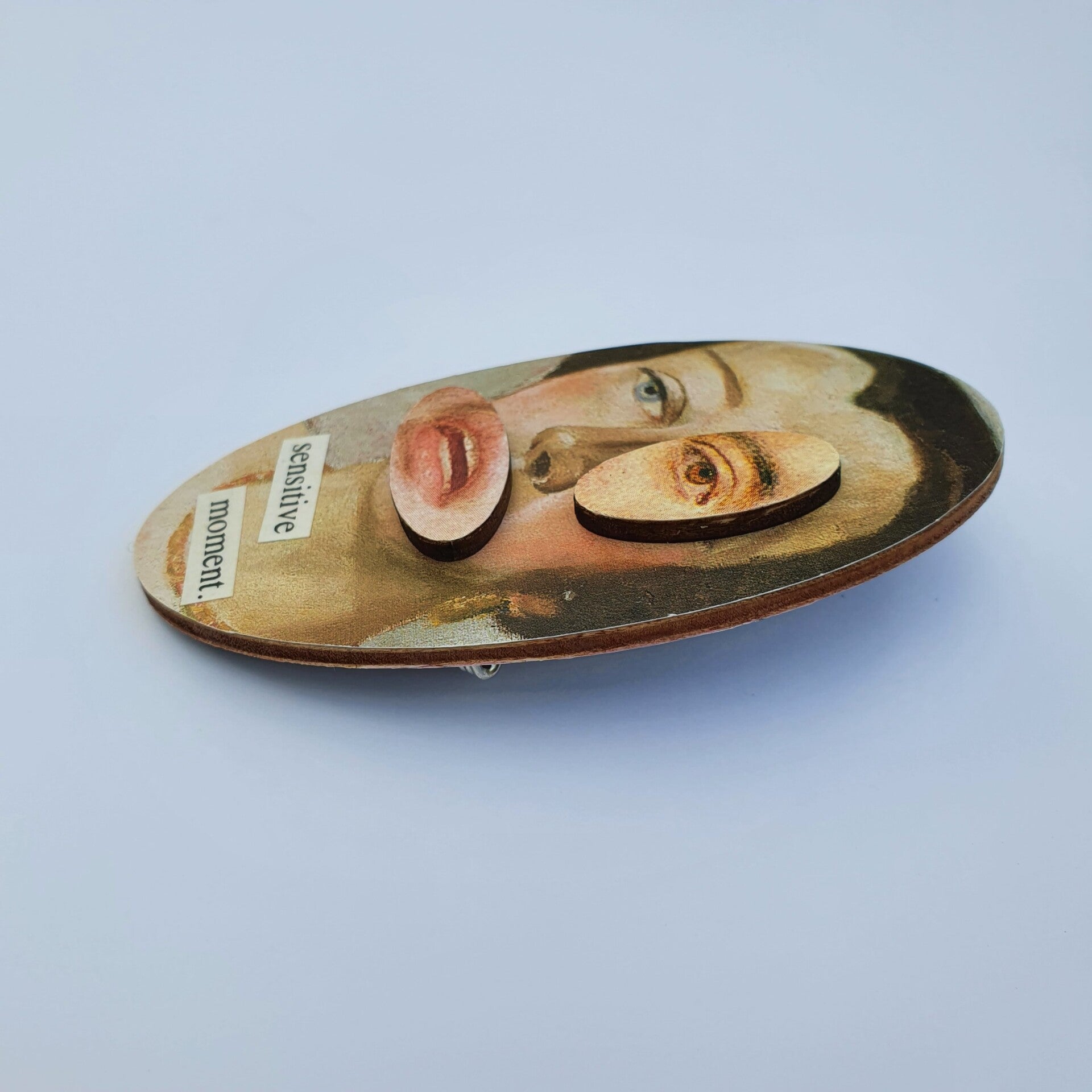 This brooch has been made using three wooden shapes, three images from an art book and two words.